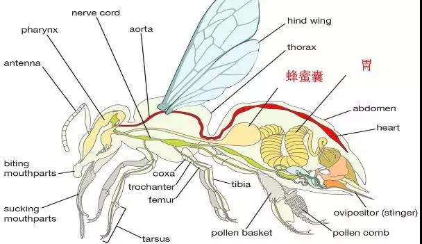 “蜂蜜囊”位于食管與前胃之間,那它與蜜蜂的胃有關(guān)系嗎?實際上,“蜂蜜囊”只是工蜂儲藏花蜜的一個“背包”,不具有消化功能。而蜜蜂的胃則為一個消化器官,可以對食物進行消化。
